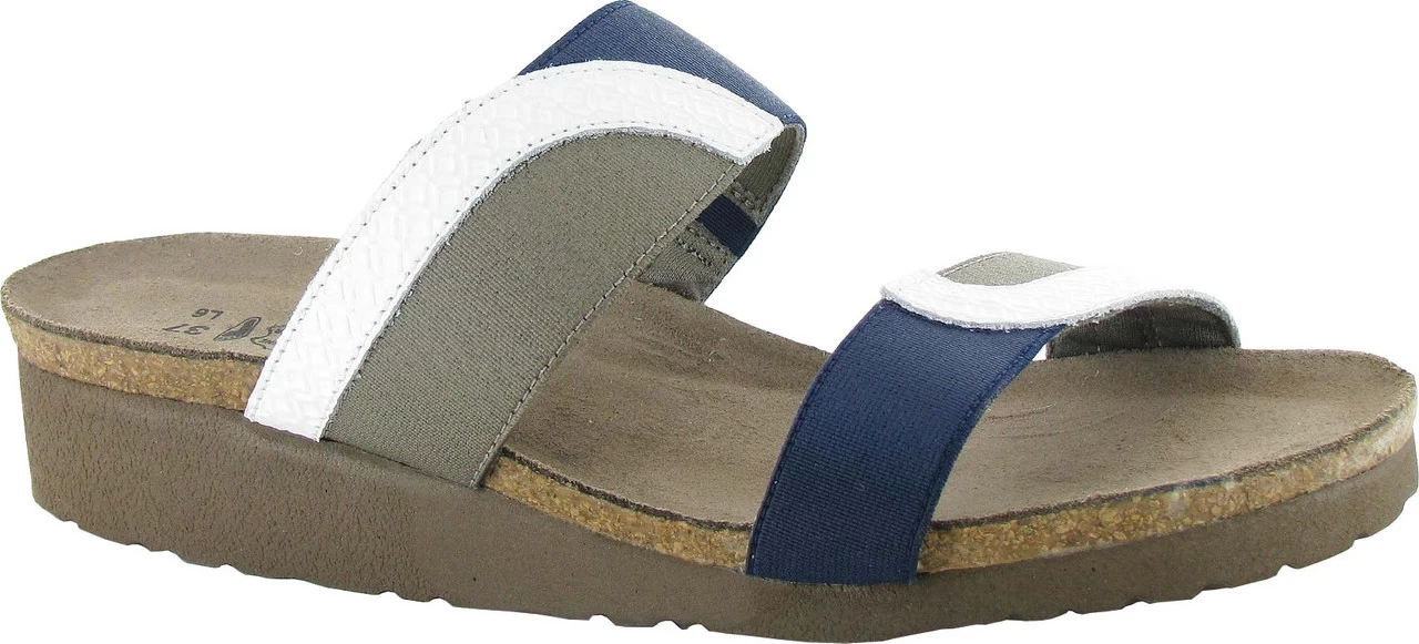 Englin’s Fine Footwear presents the women’s ‘Frankie’ from Naot. The Frankie is a fun & colorful slide sandal. This style has padded technical lining that provides comfort & absorbs moisture. The Frankie features gore at the instep for adjustability. Naot’s anatomic cork & latex footbed is wrapped in a pampering suede and molds to the shape of the foot with wear.