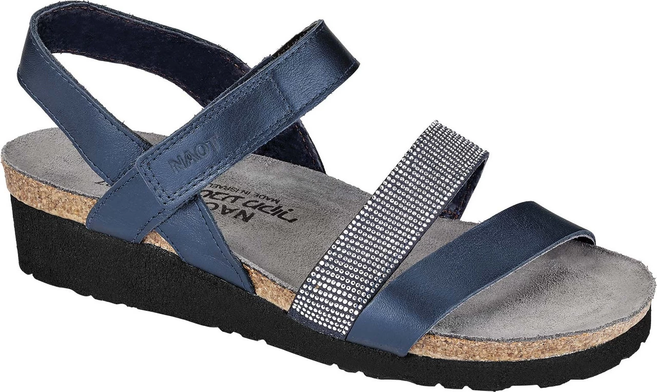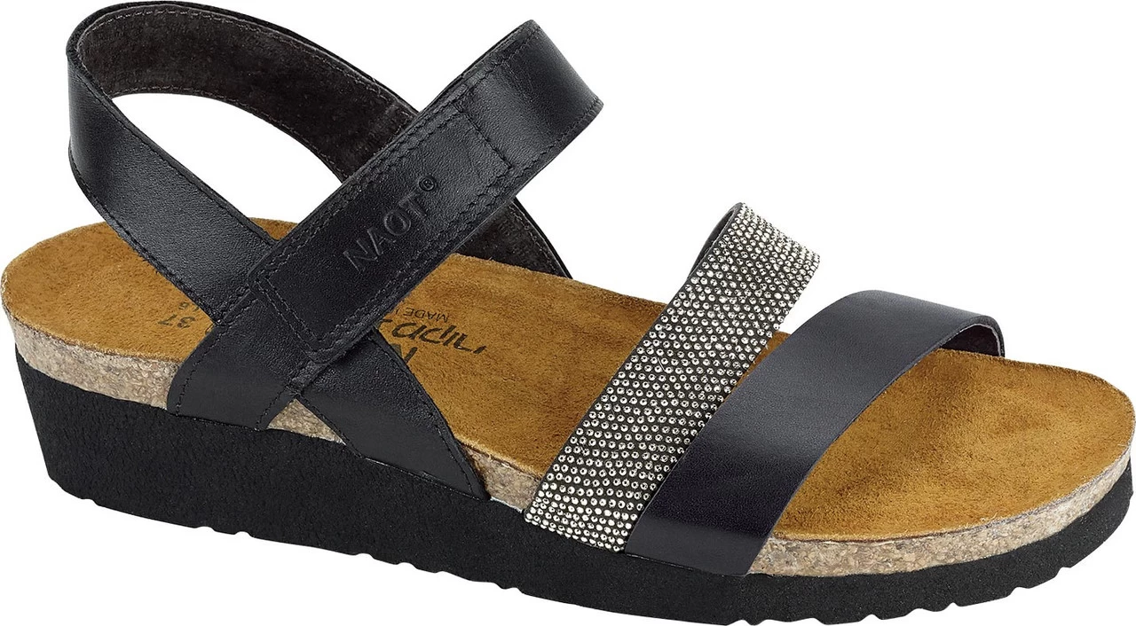 Englin’s Fine Footwear presents the women’s ‘Krista’ from Naot. The Krista is a three-strap sandal with a hook & loop strap at the instep and a backstrap for added stability and support. The Krista has gore at the middle strap for adjustability. This style features a studded strap to give it a dressier look. Naot’s anatomic cork & latex footbed is wrapped in a pampering suede and molds to the shape of the foot with wear.