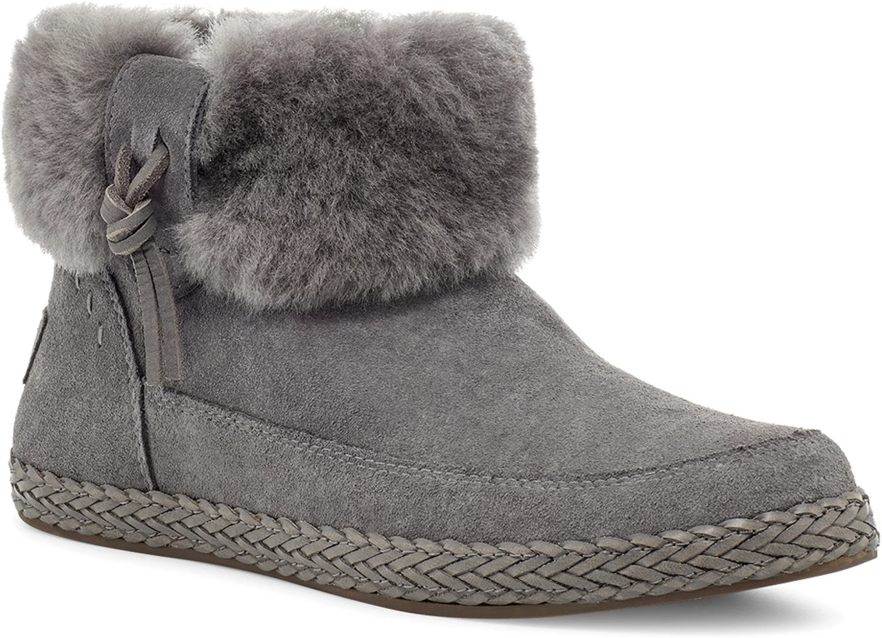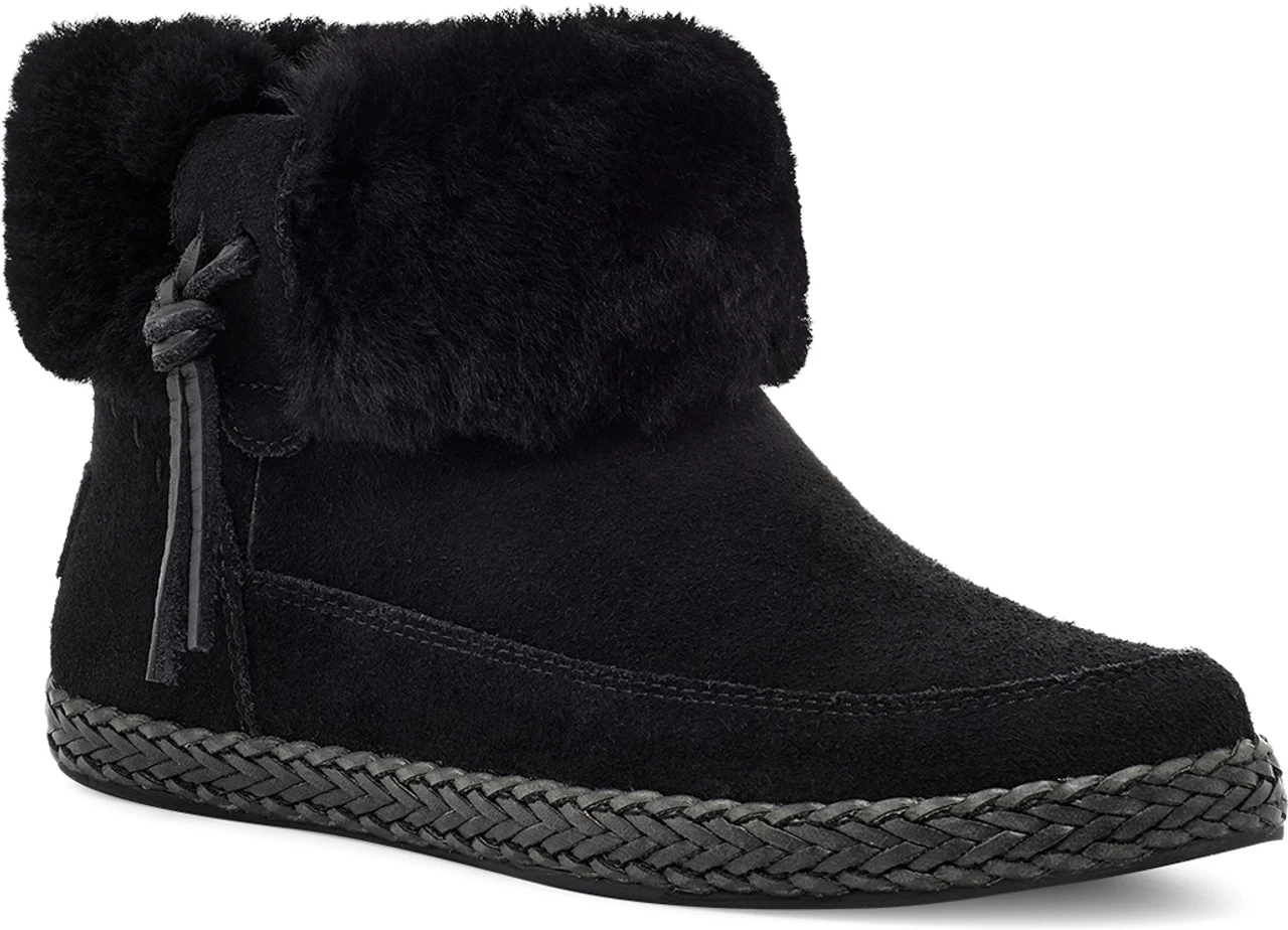 Englin’s Fine Footwear presents the women’s ‘Elowen’ from UGG. Traditional moccasin design meets California style in UGG’s fluffy-collared Elowen Boot. Made from rich suede and lined with their ultra-soft sheepskin, it features a medial zipper for easy on-off, plus a stylish braid-edged rubber sole that travels just about anywhere. Pair with jeans and a flannel, a floral dress, or leggings and a long cardigan.